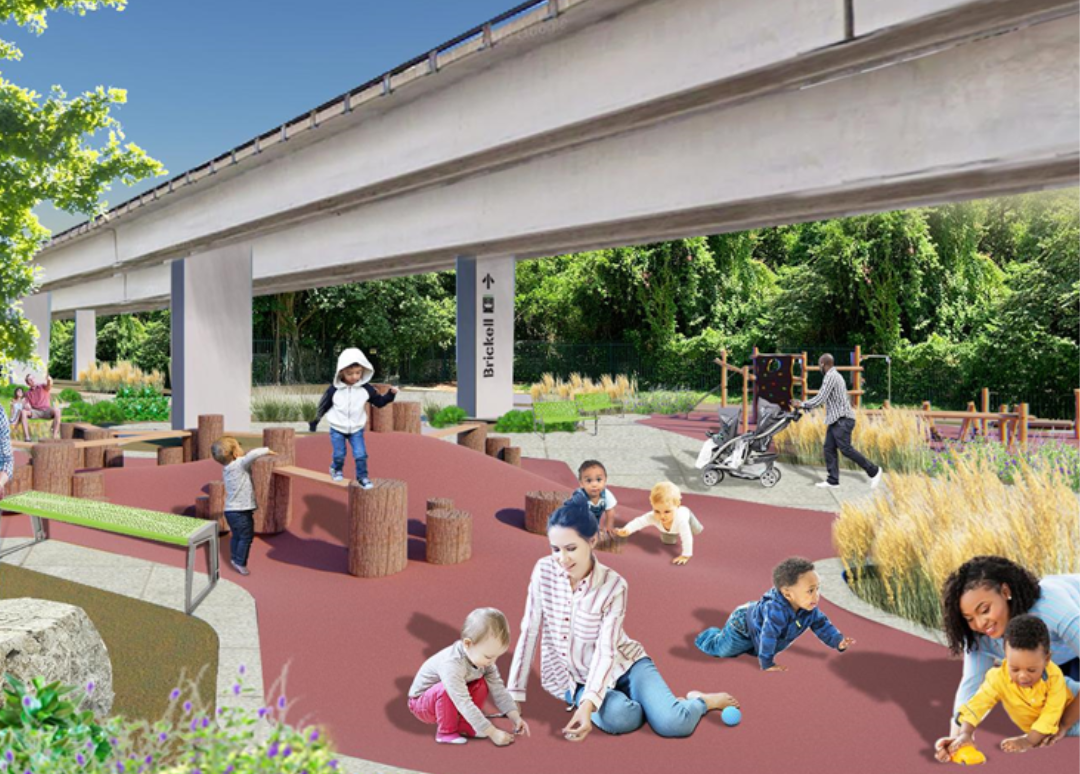 Rockridge Plaza serves as a vibrant community node along the linear park corridor, built to host events, outdoor gatherings, food vendors, art activations, and informal socializing under and around the elevated rail infrastructure. It functions as both a recreational plaza and urban living room for the surrounding neighborhood.