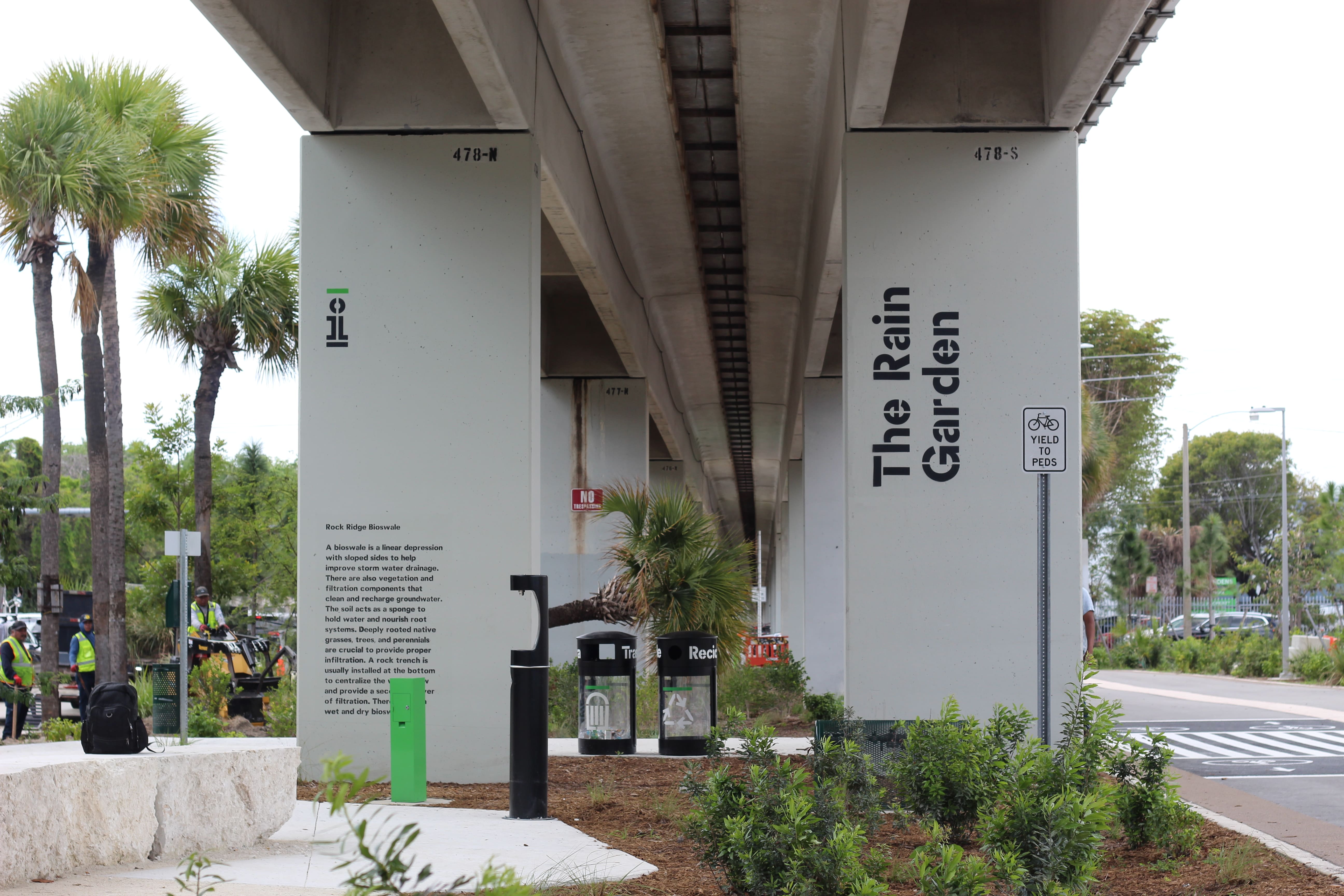 Nestled between monolithic "oolite" bluffs from SW 11th to 13th Streets, this lush naturalized zone under Metrorail, offers offering butterfly gardens, oolite boulder seating, and serene views onto surrounding bike and pedestrian paths. The Allegory, a 90 ft. mural by Haitian-American artist Edny Jean Joseph adorns existing infrastructure.