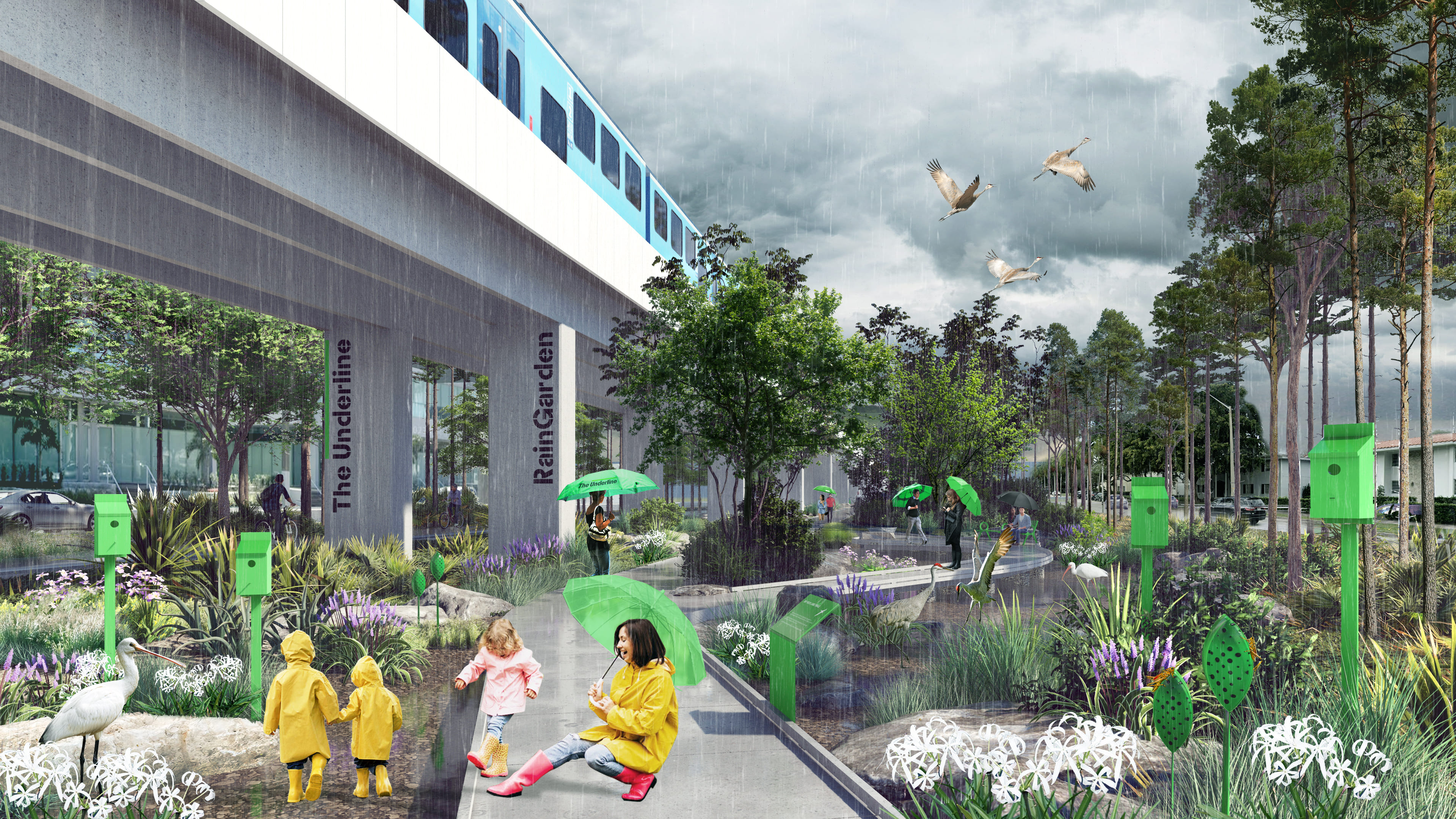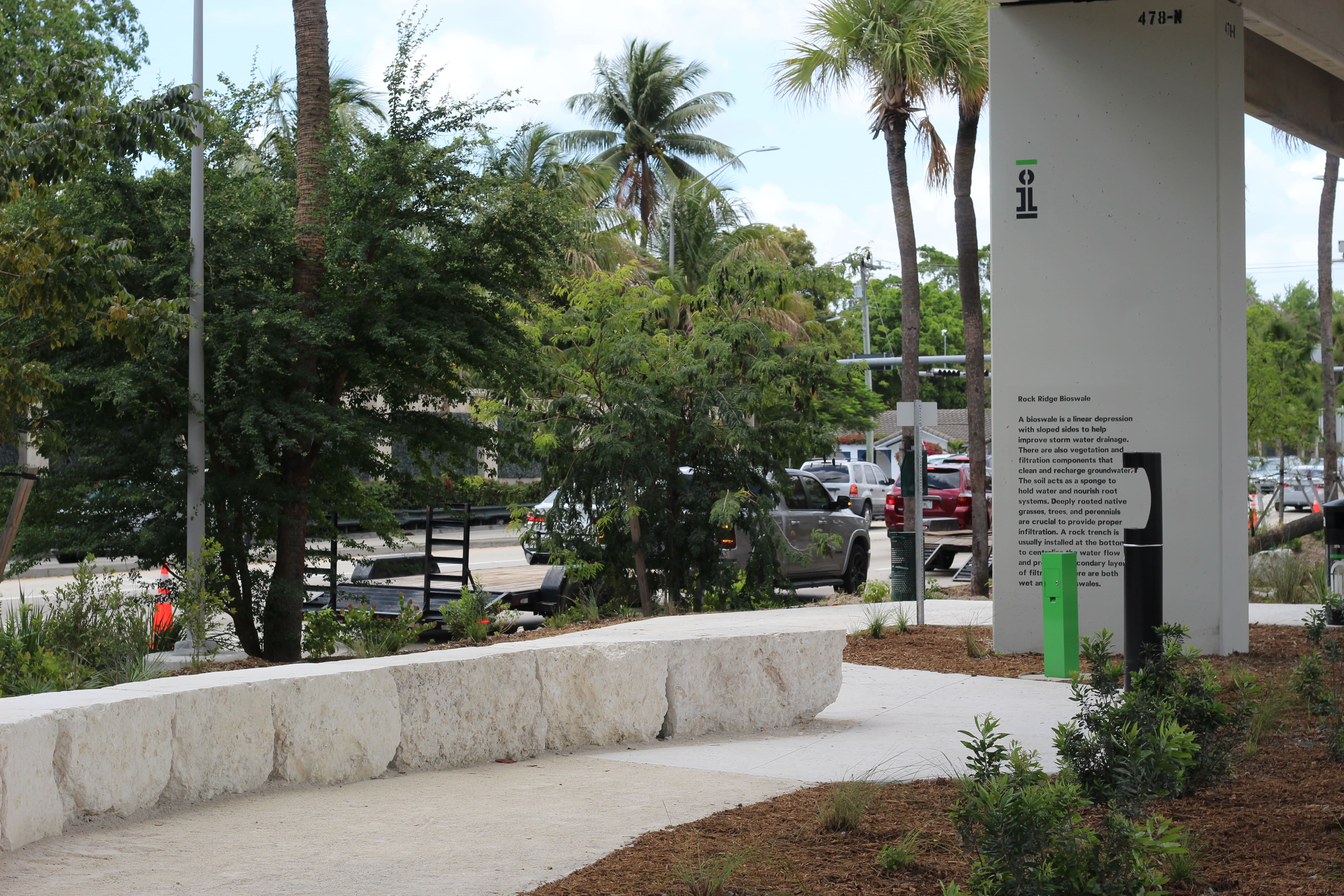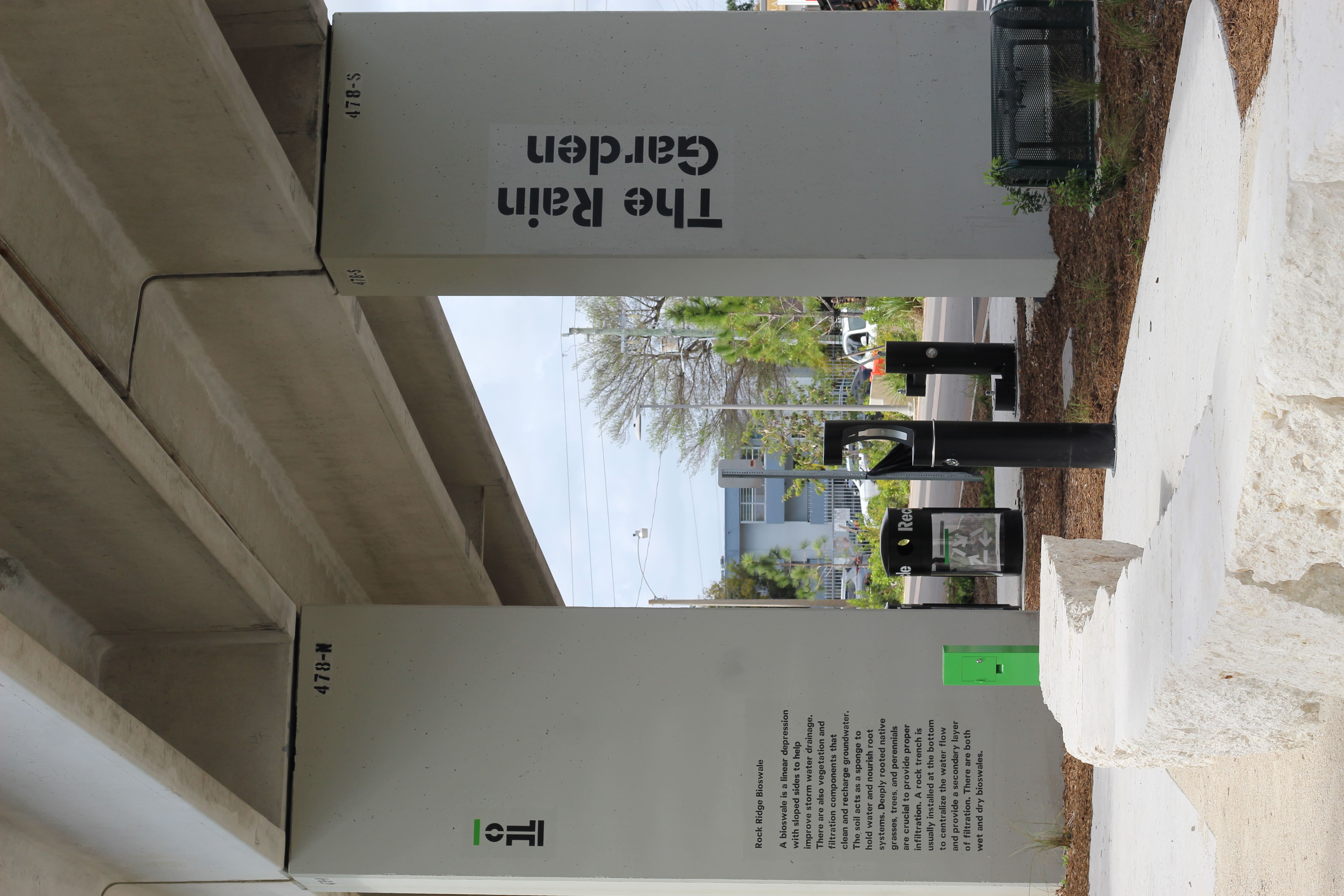 Located in Coral Gables adjacent to Ponce de Leon Blvd between Donatello Street and Granada Blvd, the Stormwater Ponds are an interconnected network of shallow planted depressions (also known as bioretention ponds). These features are designed to guide, absorb and allow stormwater from the elevated Metrorail infrastructure and adjacent urban surfaces to percolate back into the aquifer. The Stormwater Ponds are heavily planted with native vegetation so that the spaces invite both ecological function and passive enjoyment of the outdoors.