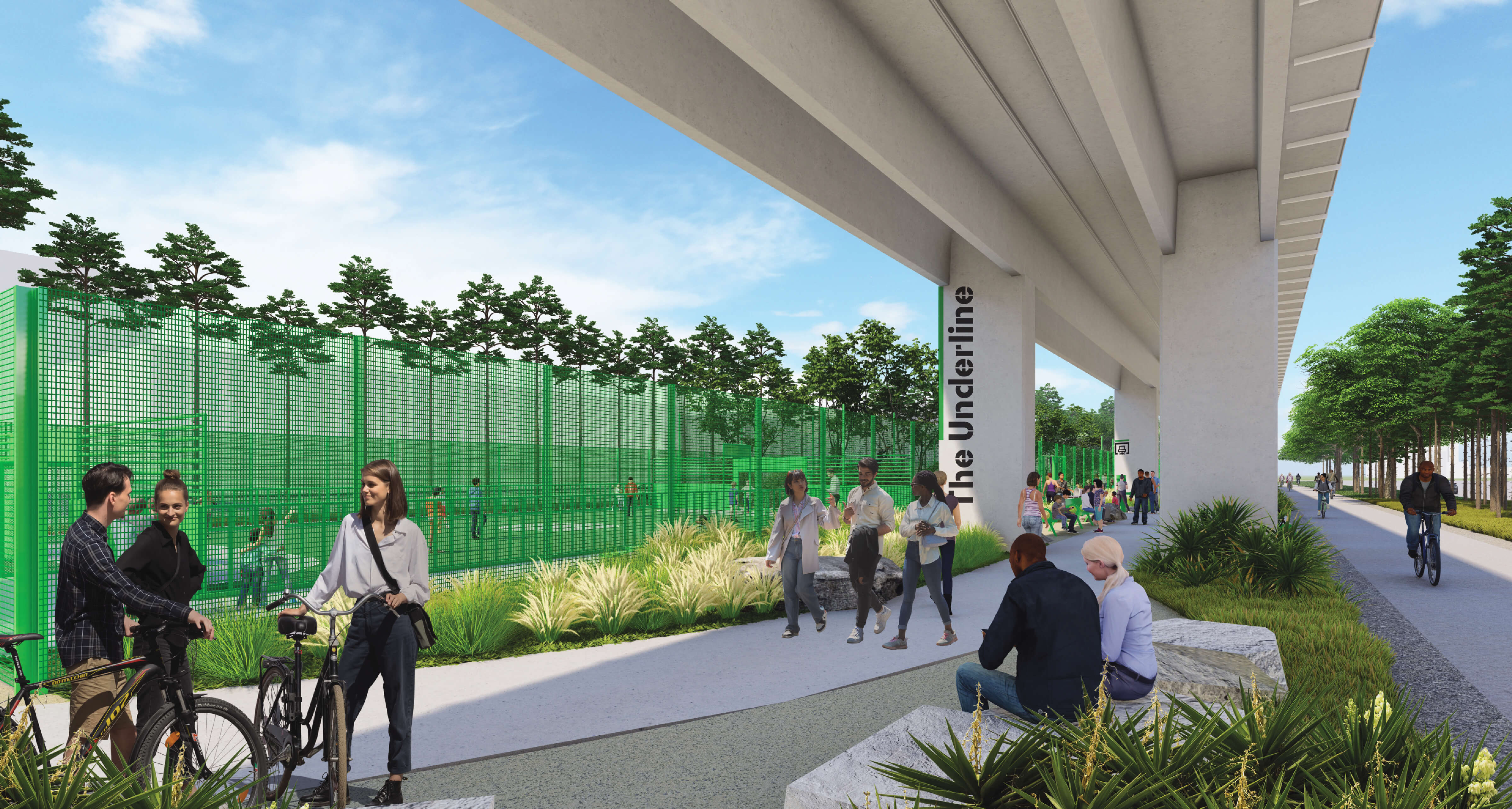 The Underline Plaza houses opportunities for local food vendors representative of Bahamian, Haitian and Latin heritage, temporary public art, and an "urban beach" for lounging under the shade of large-scale umbrellas.