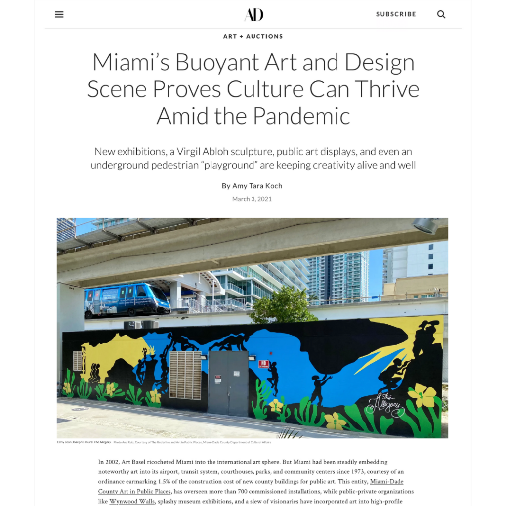 For close to two decades Miami has been through an art renaissance that has established its world-recognized reputation in the art world. Public art in Miami, however, has played a longer role in building culture for the city through Miami-Dade County Art in Public Places. Since The Underline is located on public land and is partnered with Miami-Dade County’s Department of Transportation and Public Works, it also works with Art in Public Places to bring art to our 10-mile linear park. In this article by Amy Tara Koch, Miami’s Buoyant Art and Design Scene Proves Culture Can Thrive Amid the Pandemic, you’ll learn more about how Miami, despite the Pandemic, has managed to continue its rise in art, design, and culture for the city. Including our first work of art at Brickell Backyard, a mural by the emerging and talented Edny Jean Joseph called “The Allegory,” and much more.