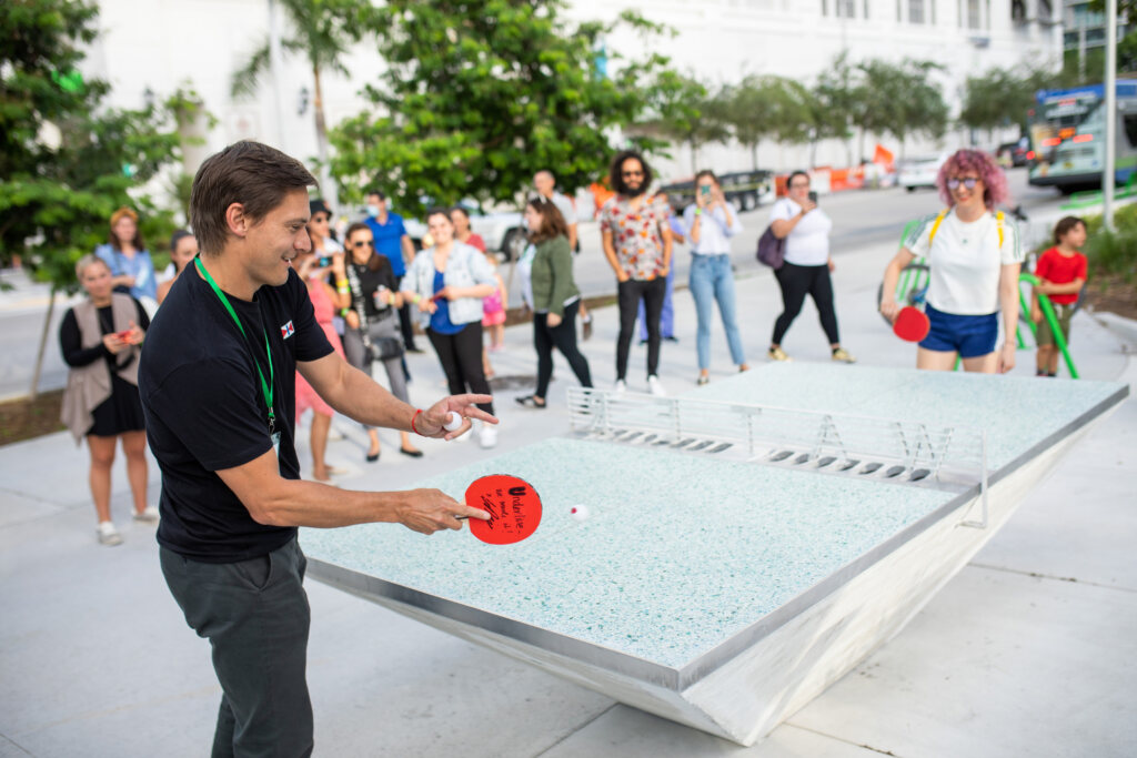 In a literal, more humorous sense, Water/Tables transform into fountains activated during times of heavy rainfall—collecting water in the storm drains in the center of the tables and pushing it out through the ball returns on either side. Sea-colored glass terrazzo surfaces quote the Miami architectural vernacular and make a direct connection to downtown’s proximity to Biscayne Bay, and the delicate ecosystems we live and play in.
