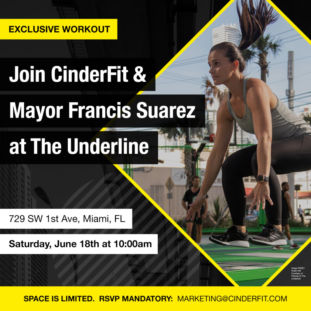 MIAMI, FL - CinderFit, a Miami-based performance fitness brand, will host a community workout, debuting its range of weighted exercise blocks, with Mayor Francis Suarez and fitness influencers on Saturday, June 18, at The Underline’s Urban Gym sponsored by Baptist Health. The workout will celebrate the intersection between South Florida entrepreneurship, the community’s flourishing parks and open spaces, and Mayor Suarez’s focus on making Miami one of the happiest and healthiest cities in America. Everyone is invited to watch the workout, plus there will be a CinderFit giveaway.